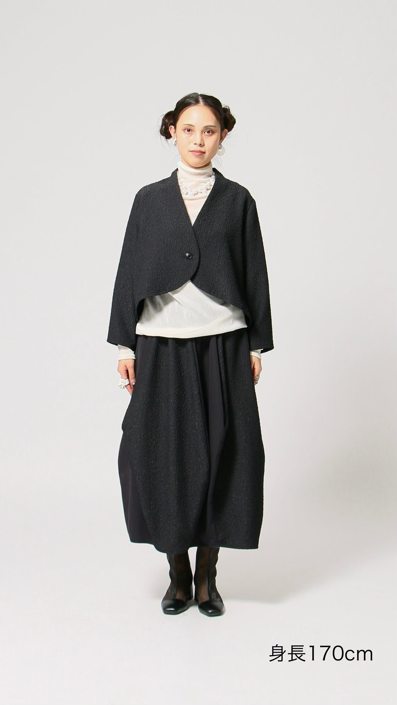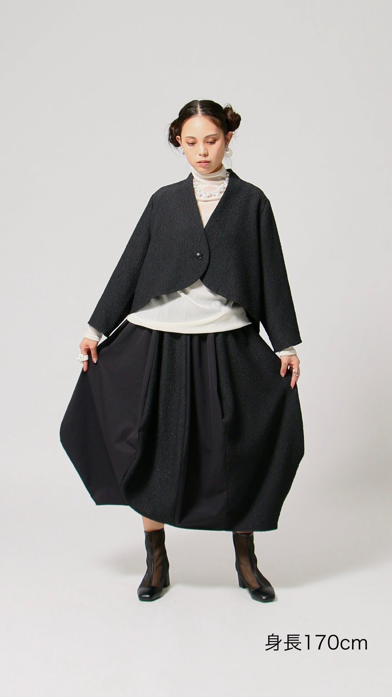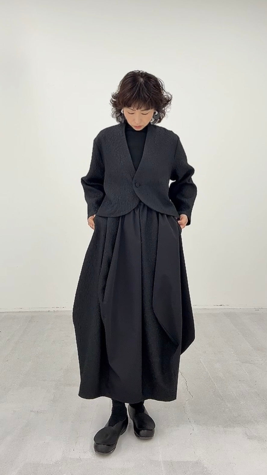 表面に独特の凹凸があり見た目にも豊かな表情がありながら、柔らかい風合いのジャガード生地と 軽量でほどよいハリ・コシのあるソロテックス生地を組み合わせたデザインスカートです。 生地を交互に配置し、シルエットのおもしろさと 素材の見え方の楽しさを表現しました。 2素材使用していますが、軽量に仕上がっており、 着心地も軽い一枚です。 【057-4979】同素材のコートがおすすめです。