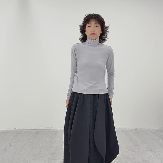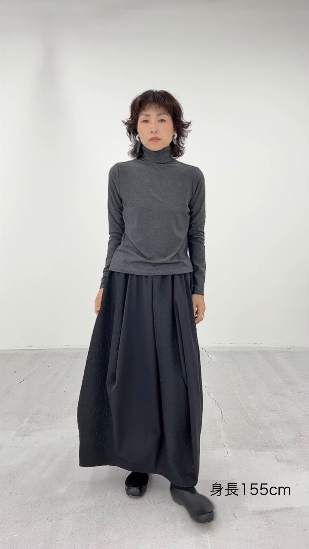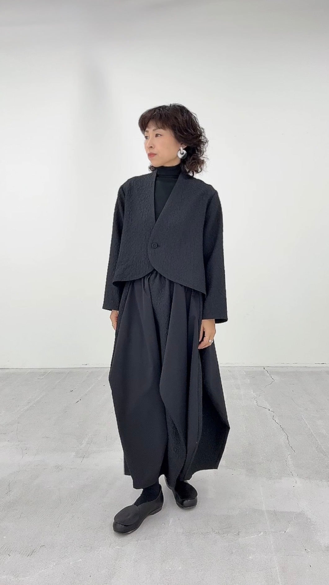 表面に独特の凹凸があり見た目にも豊かな表情がありながら、柔らかい風合いのジャガード生地と 軽量でほどよいハリ・コシのあるソロテックス生地を組み合わせたデザインスカートです。 生地を交互に配置し、シルエットのおもしろさと 素材の見え方の楽しさを表現しました。 2素材使用していますが、軽量に仕上がっており、 着心地も軽い一枚です。 【057-4979】同素材のコートがおすすめです。