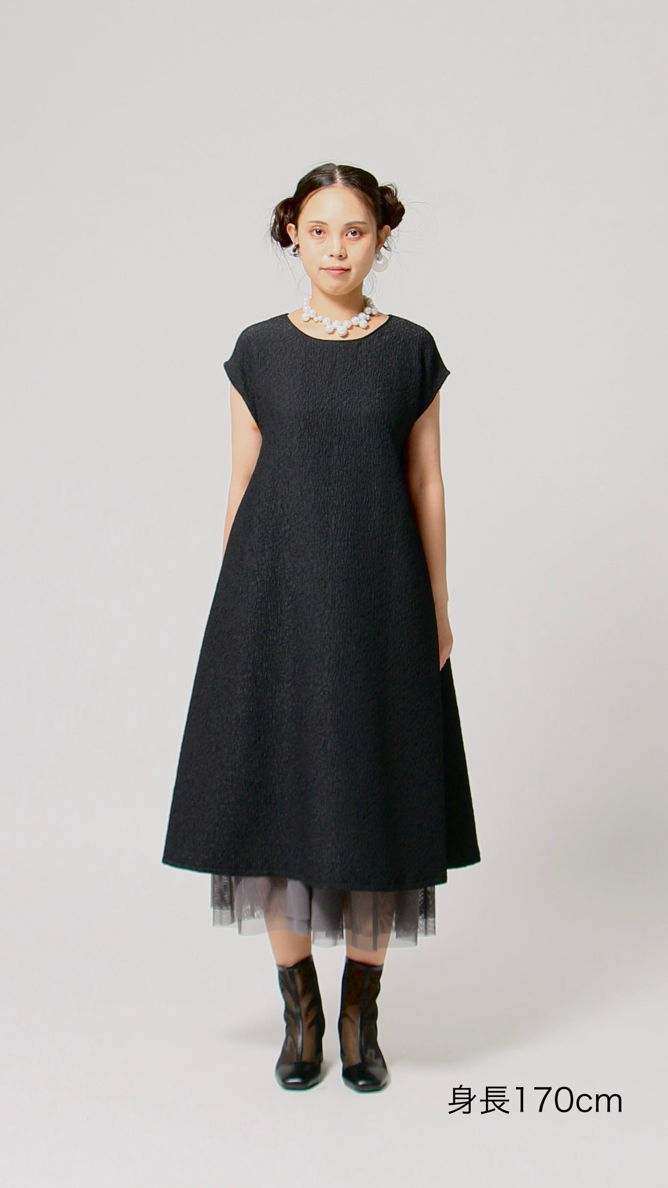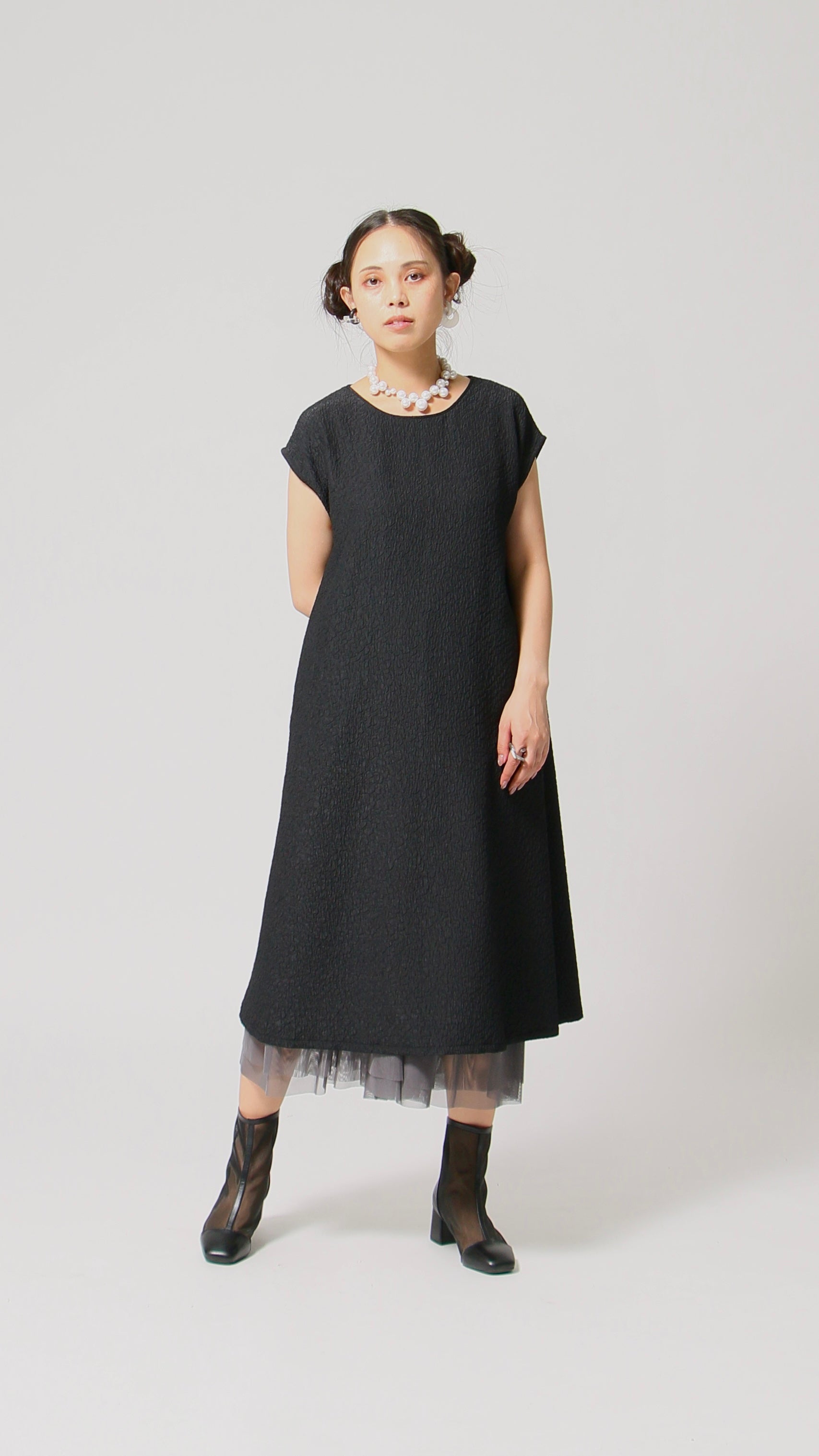 凹凸素材 ジャガード フレンチスリーブAラインワンピース 日本製(057-4982)