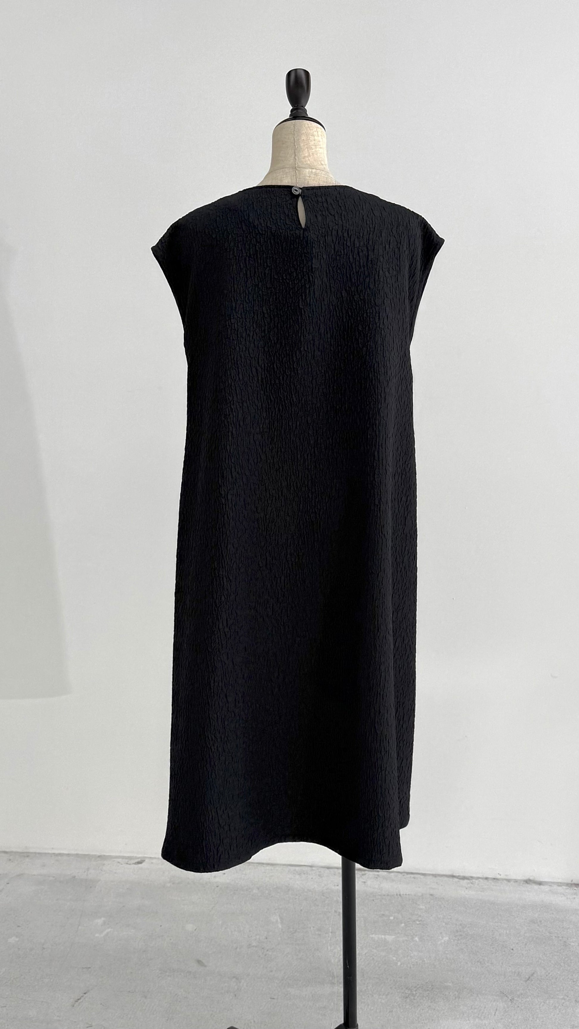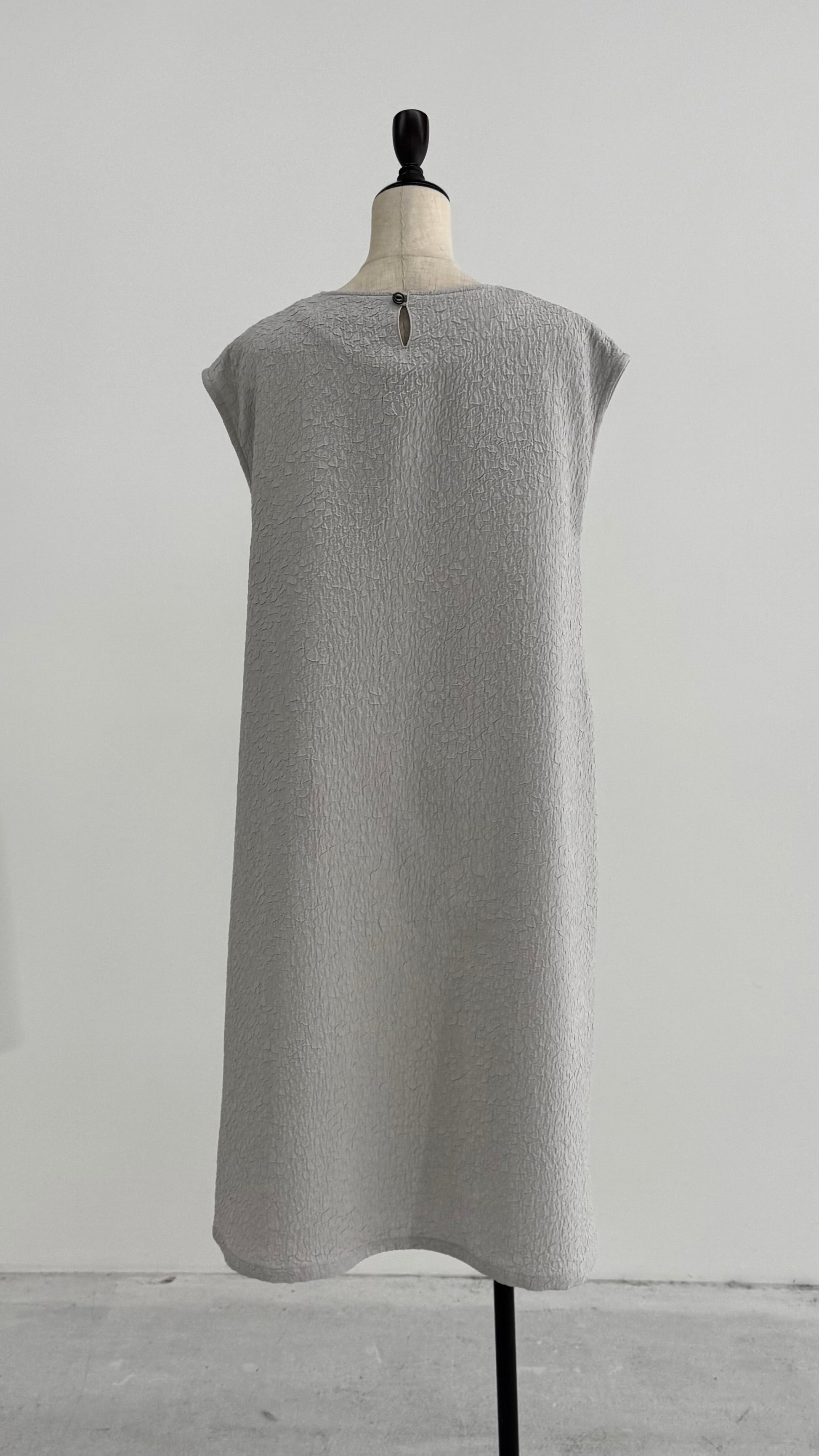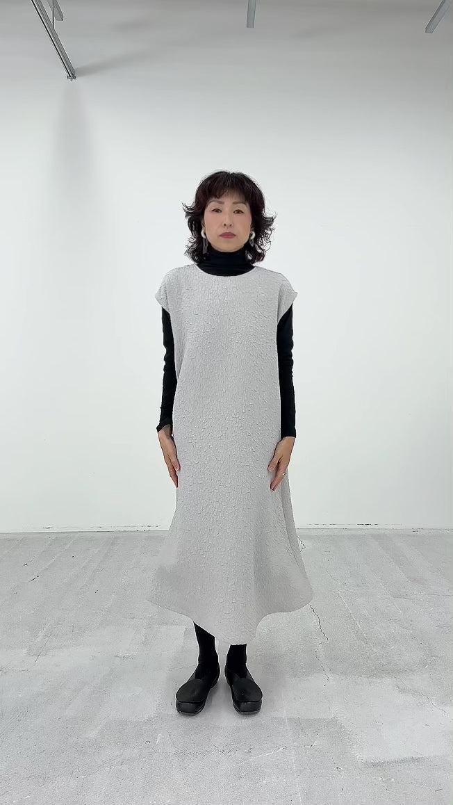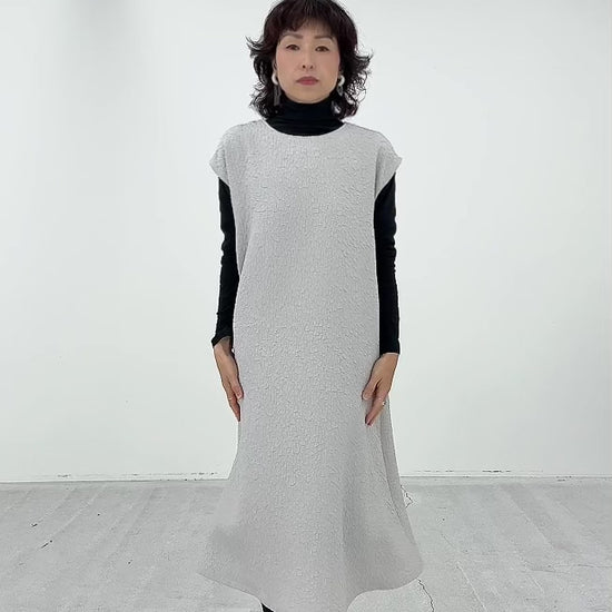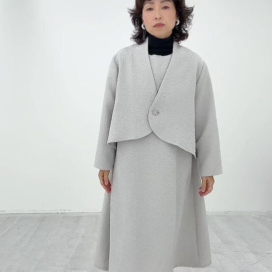 表面に独特の凹凸があり見た目にも豊かな表情がありながら、柔らかい風合いの生地です。 とても軽く、また、ジャカード織りならではのデザイン性と上品な印象を兼ね備えた素材です。 膝下までしっかり隠れる上品な丈で、ゆったりとしたサイズ感ながら、広がりすぎないソフトAラインのワンピースです。 【057-4981】同素材のジャケットとのアンサンブルでの着用をお勧めしております。