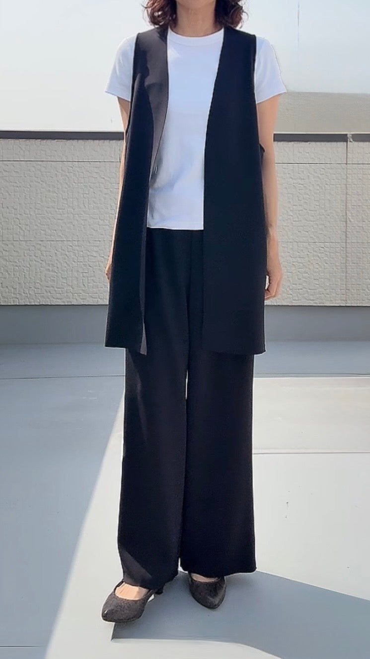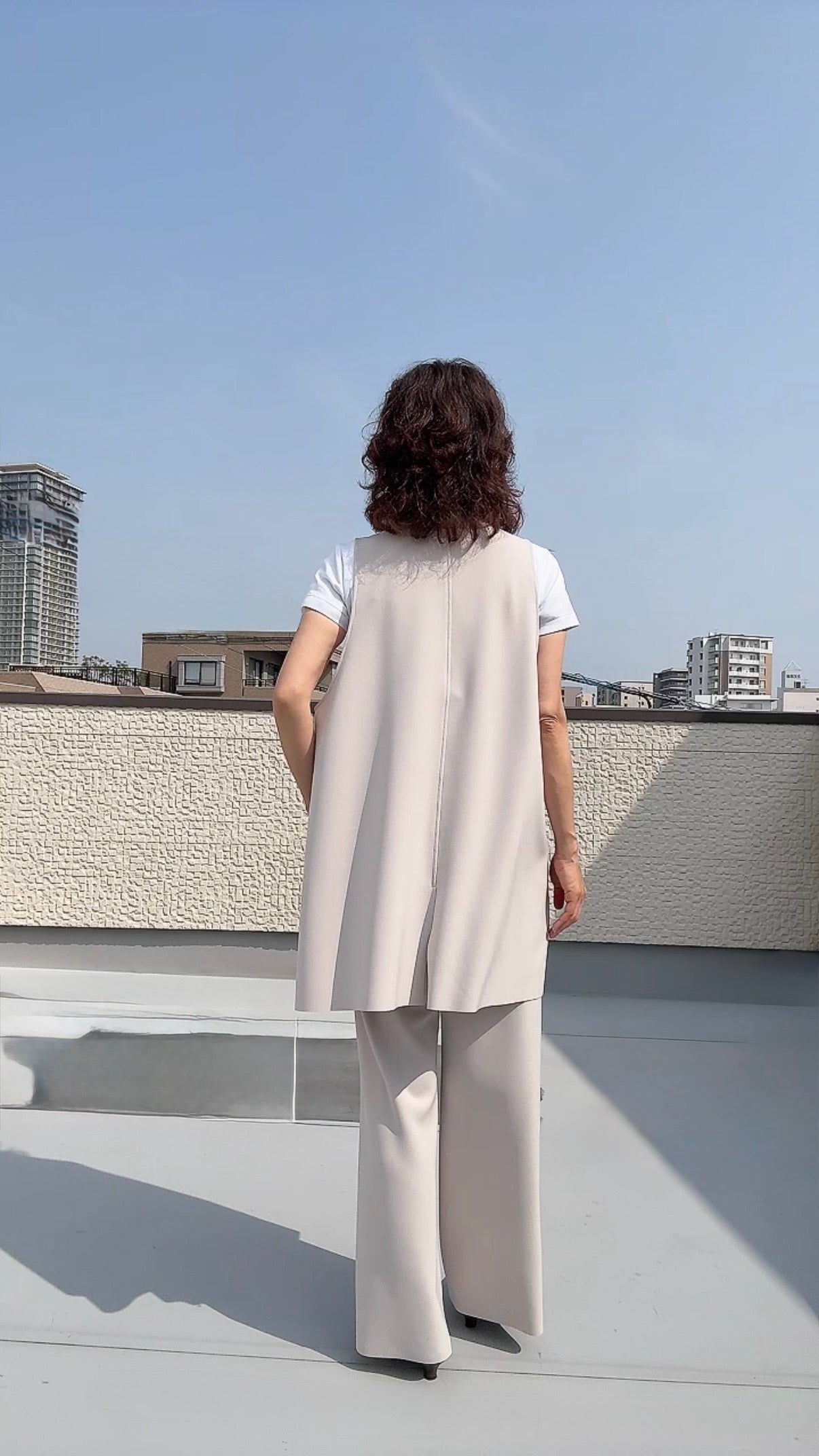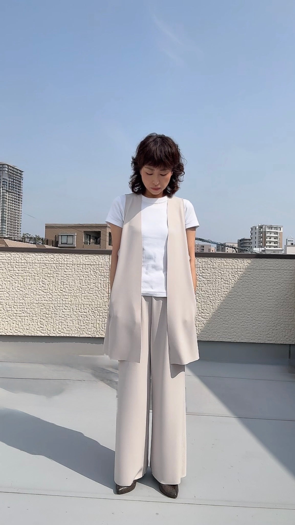 同素材のブラウスやボトムスと合わせた「3ピース」スタイルは圧巻の品格。ブラウスだけでなく、シンプルなニットやTシャツとも相性抜群です。