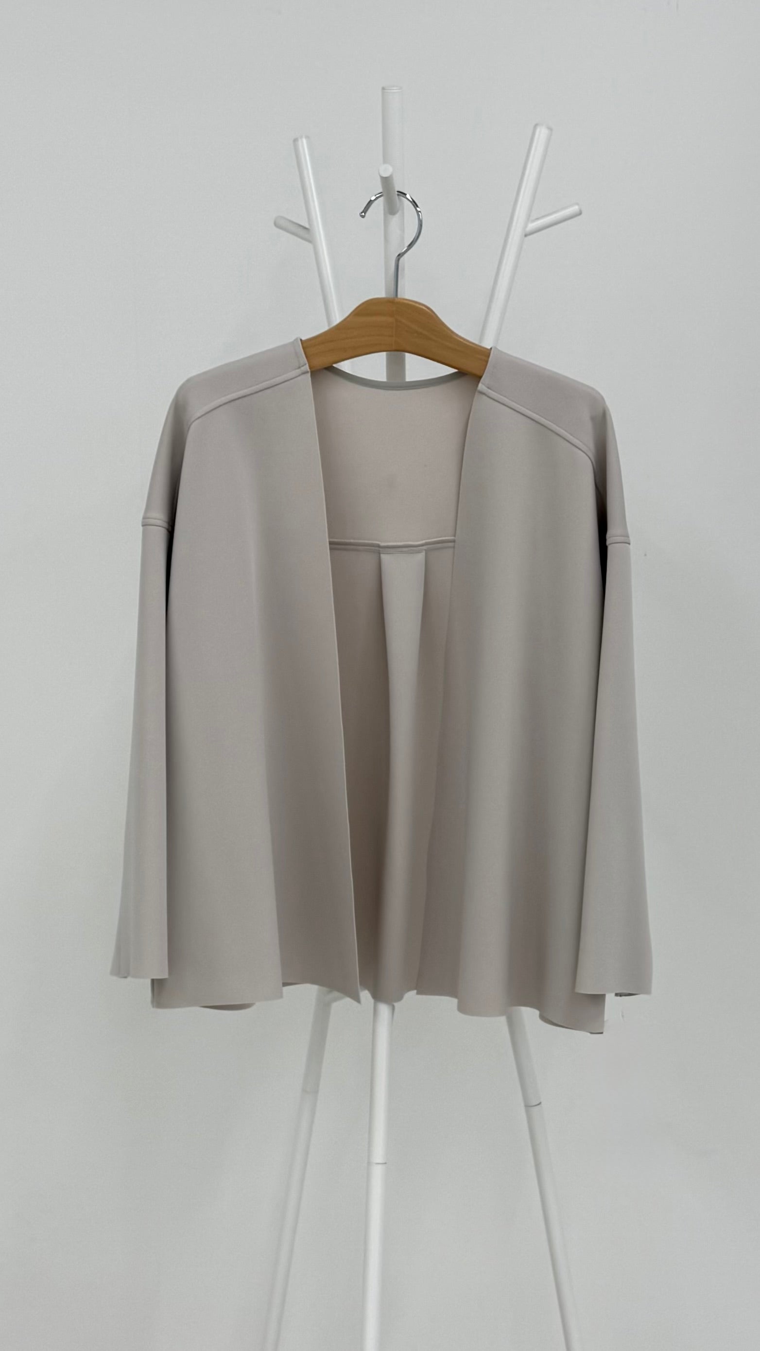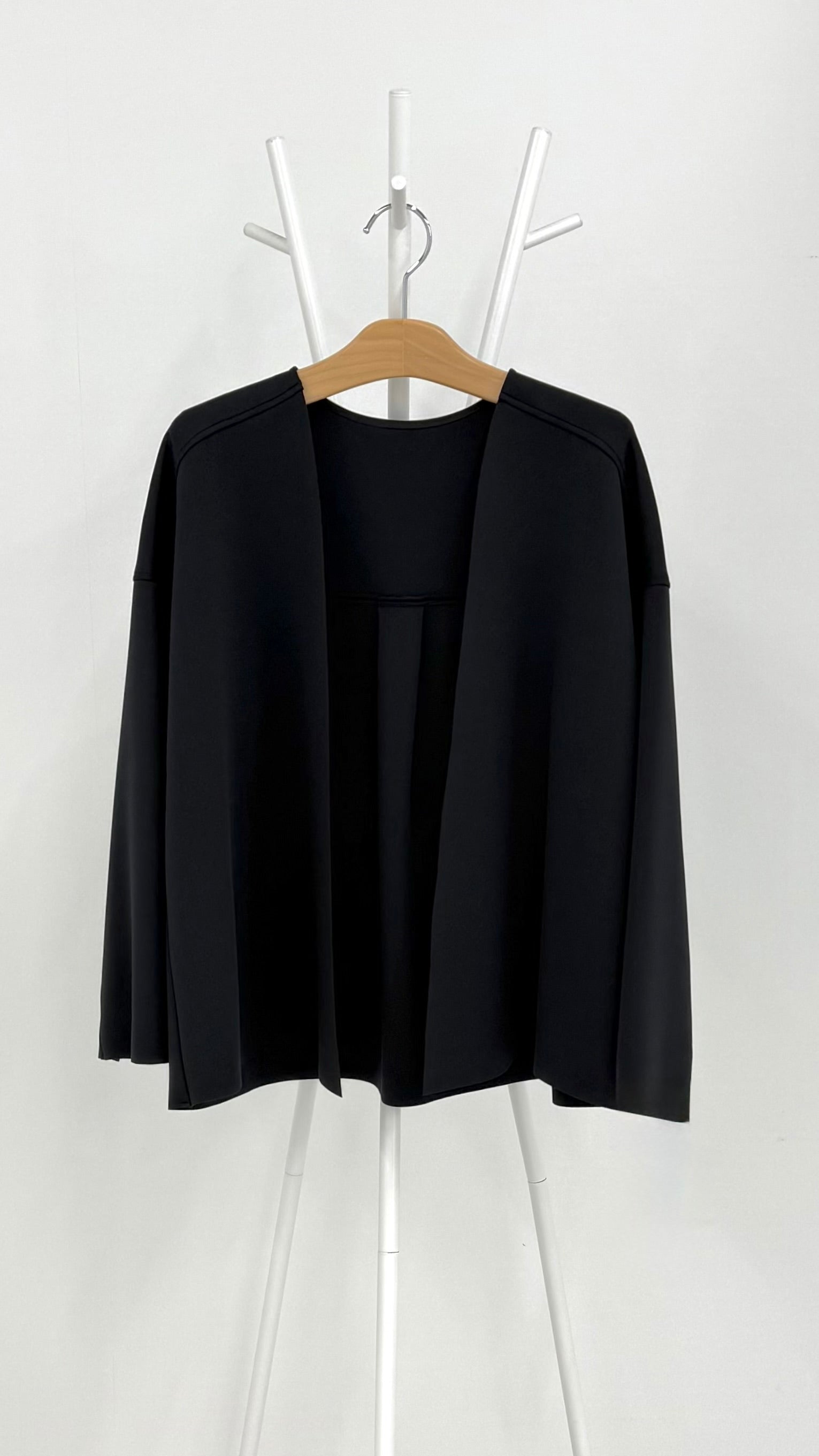 肩の凝らないダンボールニット素材と、ボタンのない着流しタイプなので、サッと羽織るだけで品格のあるスタイルが完成。
