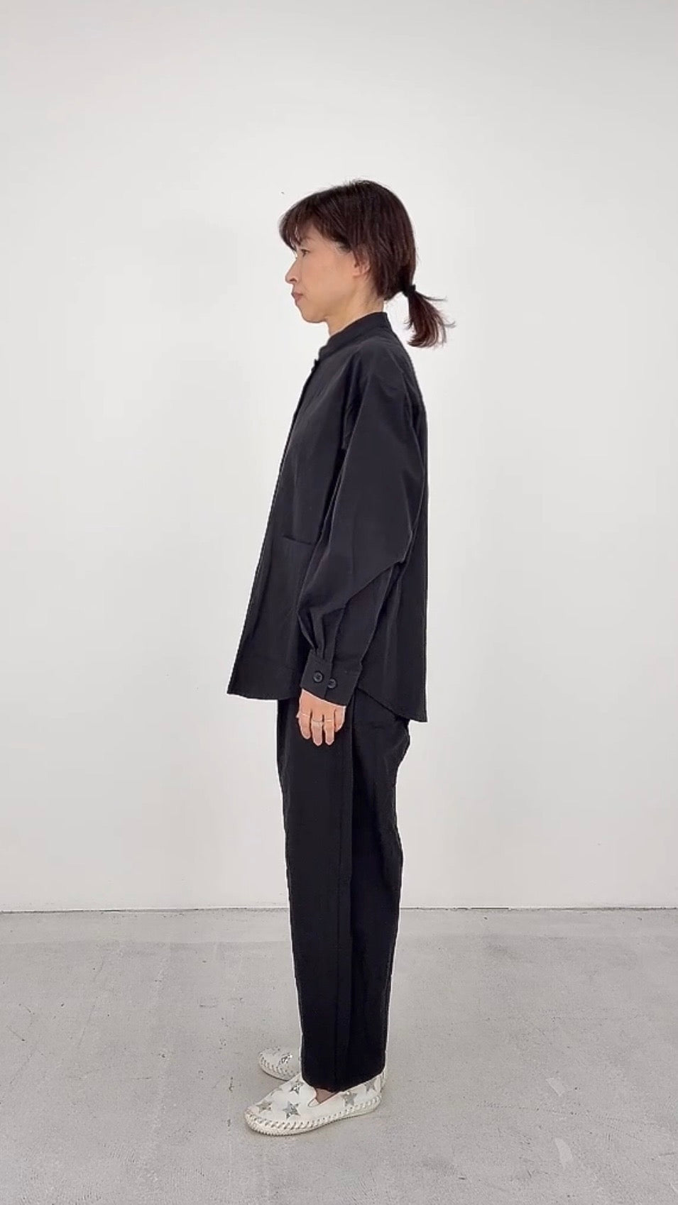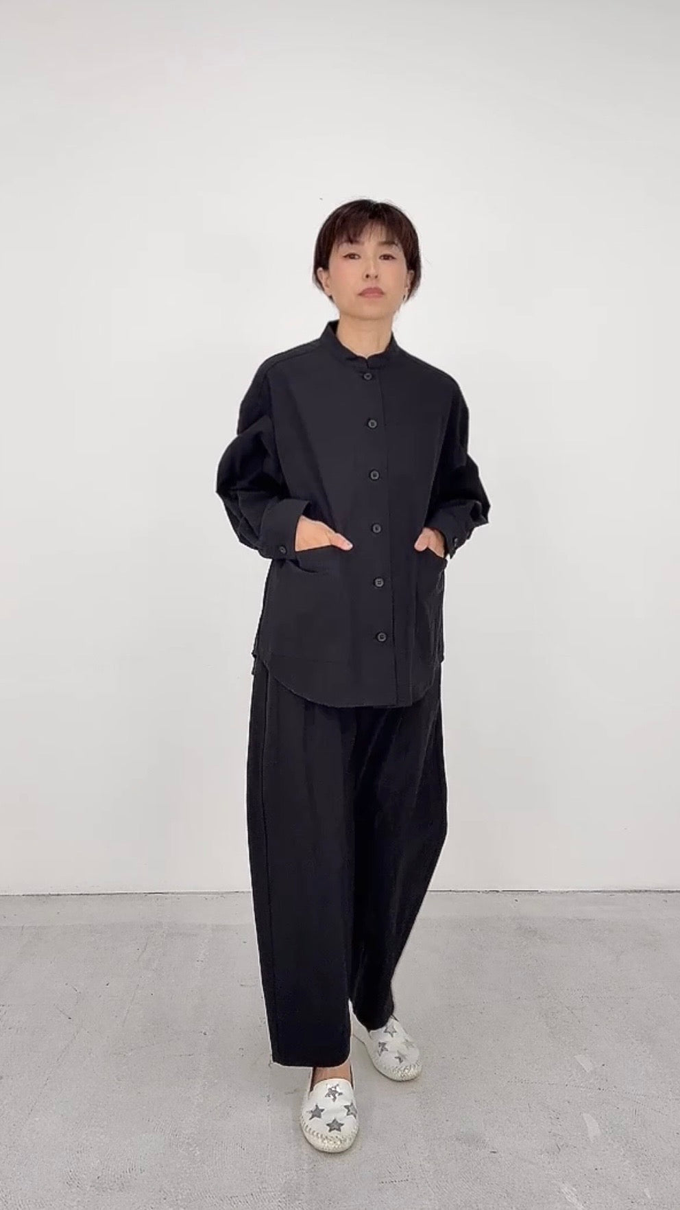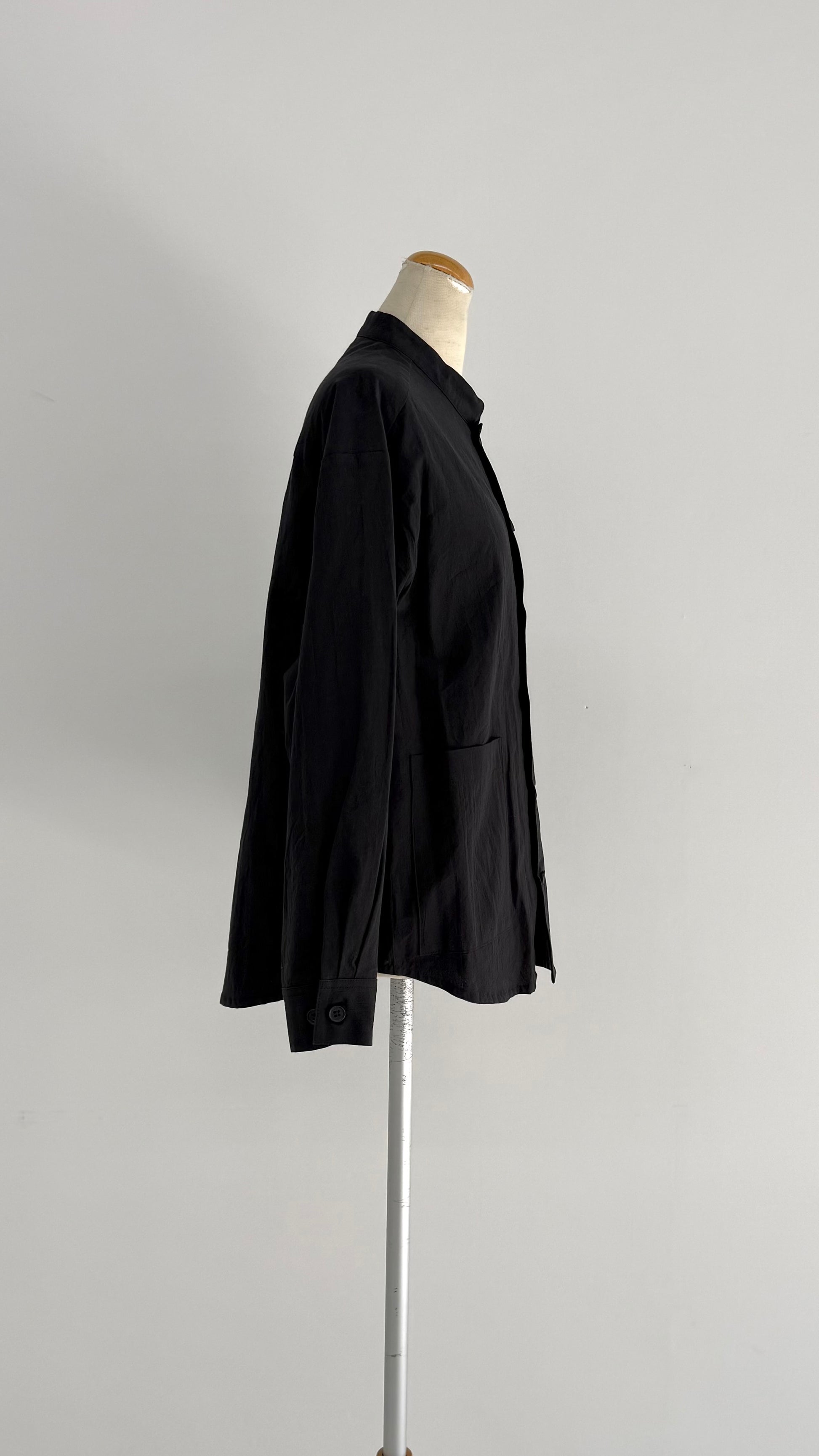 ドロップショルダーでリラックス感のある、スタンドカラーのシャツ。